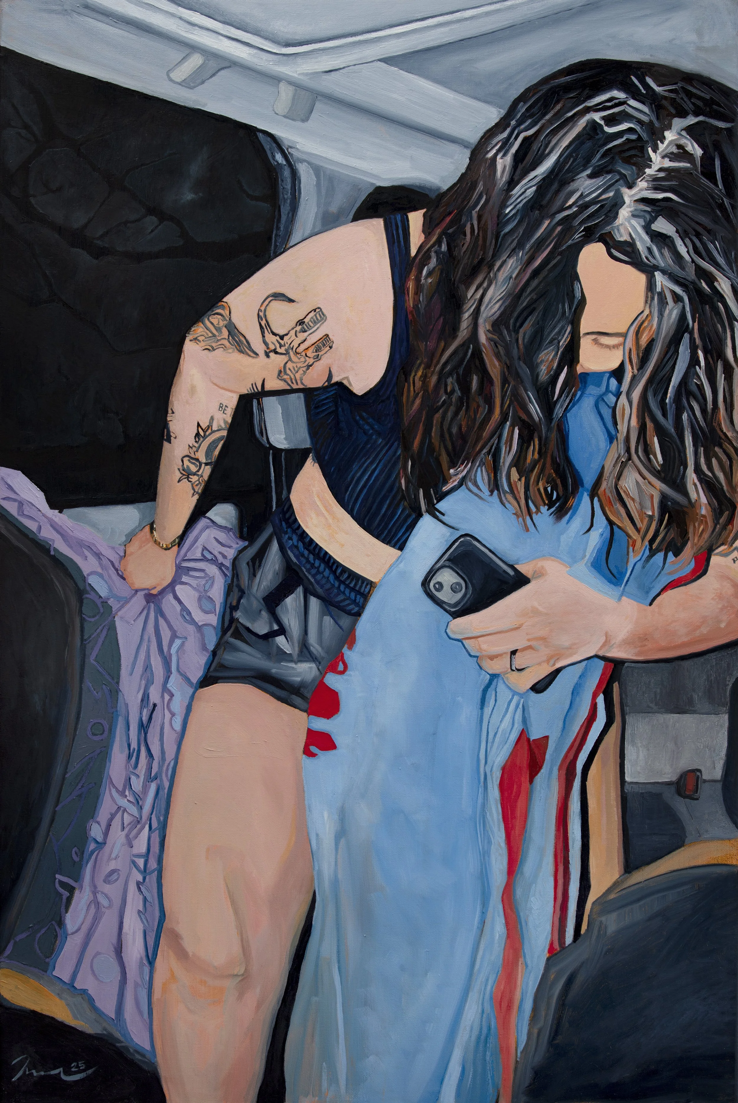 First sketched on Christmas vacation, 2023. I finished this piece a few weeks back and am just now having a good chance to post it. This painting was made with acrylic and oil, the latter atop the former. I like the way the figures notice you. The way the viewer becomes an unwelcome presence. It captures a moment of reaction, immediacy and vulnerability in the same room before one floods out the window. It reminds me of that one scene in The Shining, you know the one. This painting took a while to resolve — for the painting to be happy it required some weird decision making: the black of the background, the blue of the chair, the overall purple. It lives in a coolness, the background a flatness, the illusion dismantling, the room collapses as your eyes meet the painting’s. The figures painted are Brent Matheny and Josh Thomas (besties), thank you to them forever and always. Embrace vulnerability, sit on your friends.